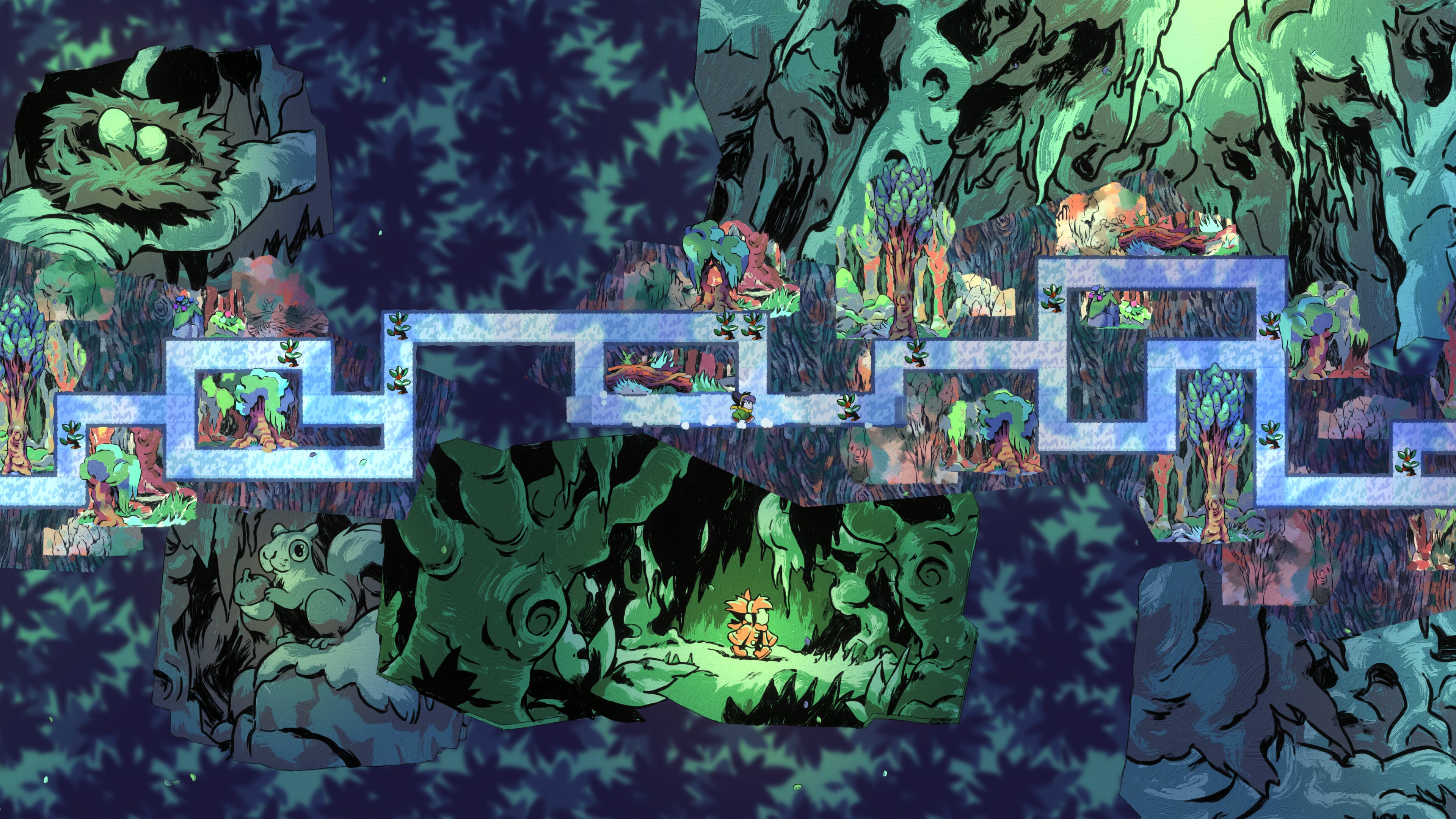 A “role-puzzling” game, Arranger is centered around the ability to rearrange the world’s tiles based on which row or column of the grids making up the world Jemma moves along. Unless a Static item blocks the way, she can loop around the paths and bring objects with her to solve puzzles and injure enemies. With the game’s focus on a grid in the centre of the screen, lead artist David Hellman (Braid) adorns the blank space with comic panels that flesh out the setting : open windows in houses, bird’s nests in forests, that kind of thing.